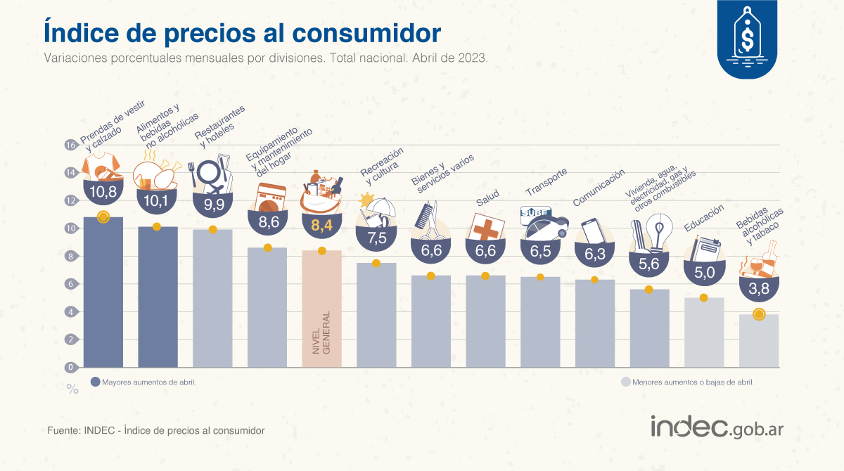El Índice de precios al consumidor registró en abril 8,4%, nivel mensual más elevado desde abril de 2002 (cuando el IPC trepó hasta el 10,4% en abril de ese año, tras la salida de la Convertibilidad). La inflación, así, acumuló en el primer trimestre del año un incremento de 32%. En los últimos 12 meses, alcanzó el 108,8%.
