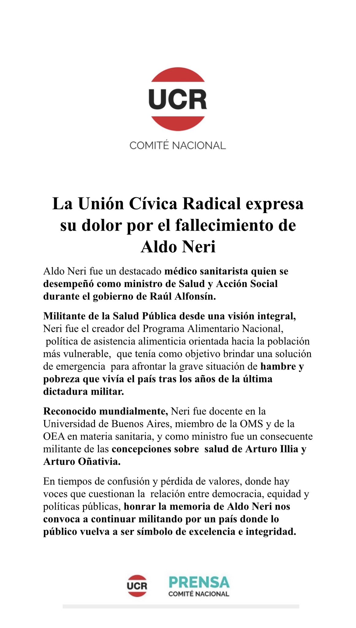 El Comité Nacional de la UCR expresó en un comunicado su "dolor" por la muerte del exministro y aseveró que "en tiempos de confusión y pérdida de valores, donde hay voces que cuestionan la relación entre democracia, equidad y políticas públicas, honrar la memoria de Aldo Neri nos convoca a continuar militando por un país donde lo público vuelva a ser símbolo de excelencia e integridad".