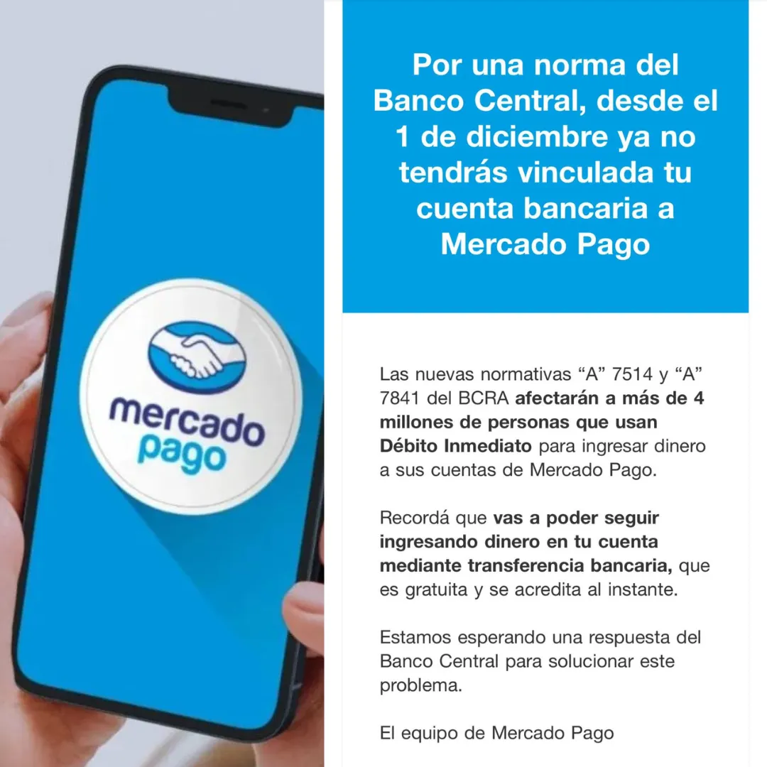 Detrás de esta medida, hay una pelea de larga data entre el Banco Central, la banca tradicional y la fintech fundada por Marcos Galperín. "Las nuevas normativas “A” 7514 y “A” 7841 del BCRA afectarán a más de 4 millones de personas que usan Débito Inmediato para ingresar dinero a sus cuentas de Mercado Pago", explicó la app a sus clientes. " Recordá que vas a poder seguir ingresando dinero en tu cuenta mediante transferencia bancaria, que es gratuita y se acredita al instante", añadió la comunicación.