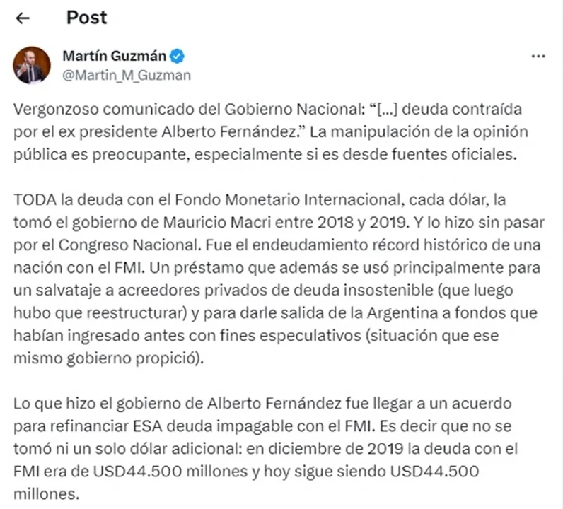 El exministro de Economía, Martín Guzmán, se sumó a la ola de críticas efectuadas al gobierno de Javier Milei tras el comunicado oficial acerca del acuerdo con el FMI.