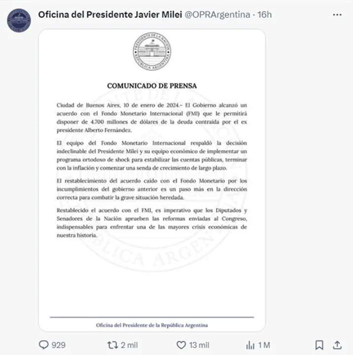 El texto que circuló a través de la cuenta de la Oficina del Presidente Javier Milei, en la red social X, dice que el acuerdo anunciado el miércoles por el ministro de Economía Caputo “le permitirá (al Estado) disponer de 4.700 millones de dólares de la deuda contraída por el ex presidente Alberto Fernández”.