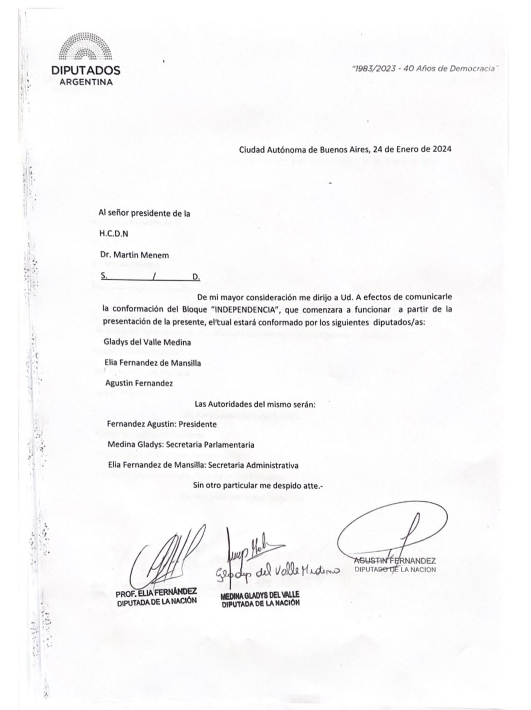 Tres diputados de Tucumán decidieron este miércoles romper con el bloque de Unión por la Patria (UP) y crearon uno propio, bautizado Independencia, en la Cámara Baja. El nuevo bloque está compuesto por Agustín Fernández -el único legislador de UP que el martes a la noche no firmó el dictamen de rechazo a la ley ómnibus de Javier Milei, a pedido del gobernador de su provincia, Jaldo-, Gladys del Valle Medina y Elia Fernández de Mansilla.