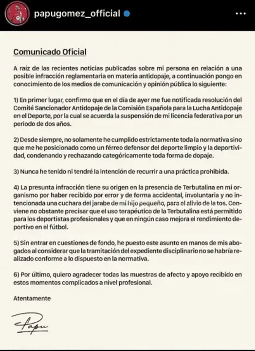 Gómez fue suspendido por “negligencia grave” tras haber consumido terbutalina, una sustancia prohibida por la Agencia Mundial Antidopaje (AMA). Luego de conocerse la noticia, el futbolista publicó un comunicado en sus redes sociales y esgrimió que tomó por error un jarabe para la tos de su hijo menor.