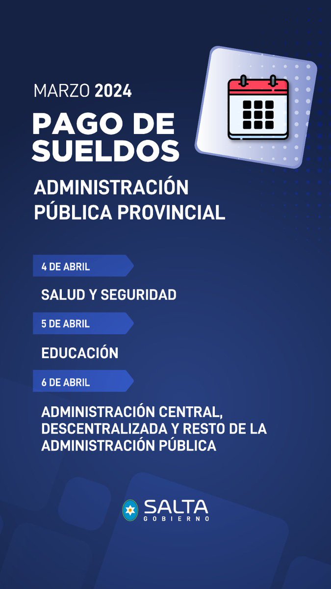 El Gobierno de la Provincia dio a conocer las fechas de cobro del sueldo correspondiente a marzo de 2024 para la Administración Pública Provincial.