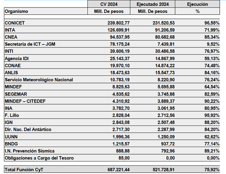 "A nivel de la Función CyT, en tan sólo 6 meses, se ha ejecutado el 75,92% del Crédito, y hay organismos como el Conicet que ya han ejecutado el 96% de su crédito", indica el informe.