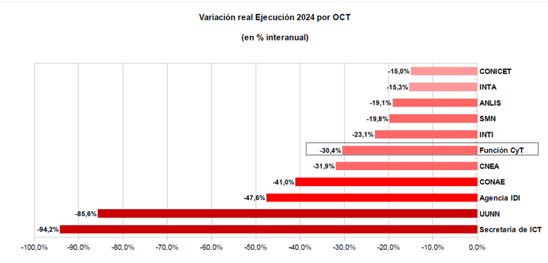 La variación real de la ejecución del presupuesto de los organismos de ciencia y tecnología continúa descendiendo en relación al 2023. La Función Ciencia y Tecnología del presupuesto nacional, que engloba toda la inversión estatal en el sector, perdió un 30,4%, según publicó el Grupo EPC-CIICTI, que estudia mes a mes la evolución de las políticas científicas a nivel nacional.