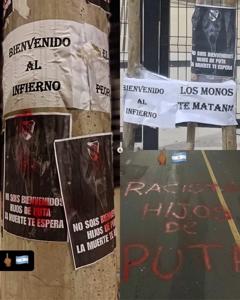 “Bienvenidos al infierno”, “Los monos te matan”, “No son bienvenidos hijos de puta, la muerte te espera”, son algunas de las frases que se leen en los papeles pegados en la puerta de la cancha.