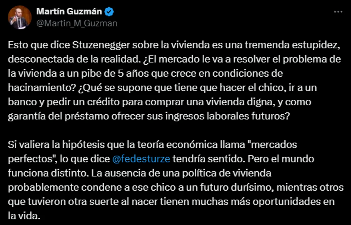 El economista también argumentó: "Si valiera la hipótesis que la teoría económica llama 'mercados perfectos', lo que dice @fedesturze tendría sentido. Pero el mundo funciona distinto. La ausencia de una política de vivienda probablemente condene a ese chico a un futuro durísimo, mientras otros que tuvieron otra suerte al nacer tienen muchas más oportunidades en la vida".