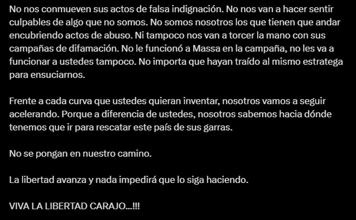 “Frente a cada curva que ustedes quieran inventar, nosotros vamos a seguir acelerando. Porque a diferencia de ustedes, nosotros sabemos hacia dónde tenemos que ir para rescatar este país de sus garras. La libertad avanza y nada impedirá que lo siga haciendo”, concluyó.