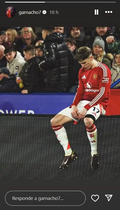 A través de su cuenta oficial de Instagram (@garnacho7), el atacante nacido en Madrid les confirmó a sus casi doce millones de seguidores que se siente apenado por no figurar en la nómina del campeón del mundo. Allí publicó una historia con una imagen propia sentado sobre un cartel de publicidad mirando hacia abajo en su último encuentro. De hecho, prefirió postear esa storie y no una de él festejando porque hizo un tanto luego de mucho tiempo y el equipo dirigido por el portugués Ruben Amorim ganó fuera de Old Trafford.