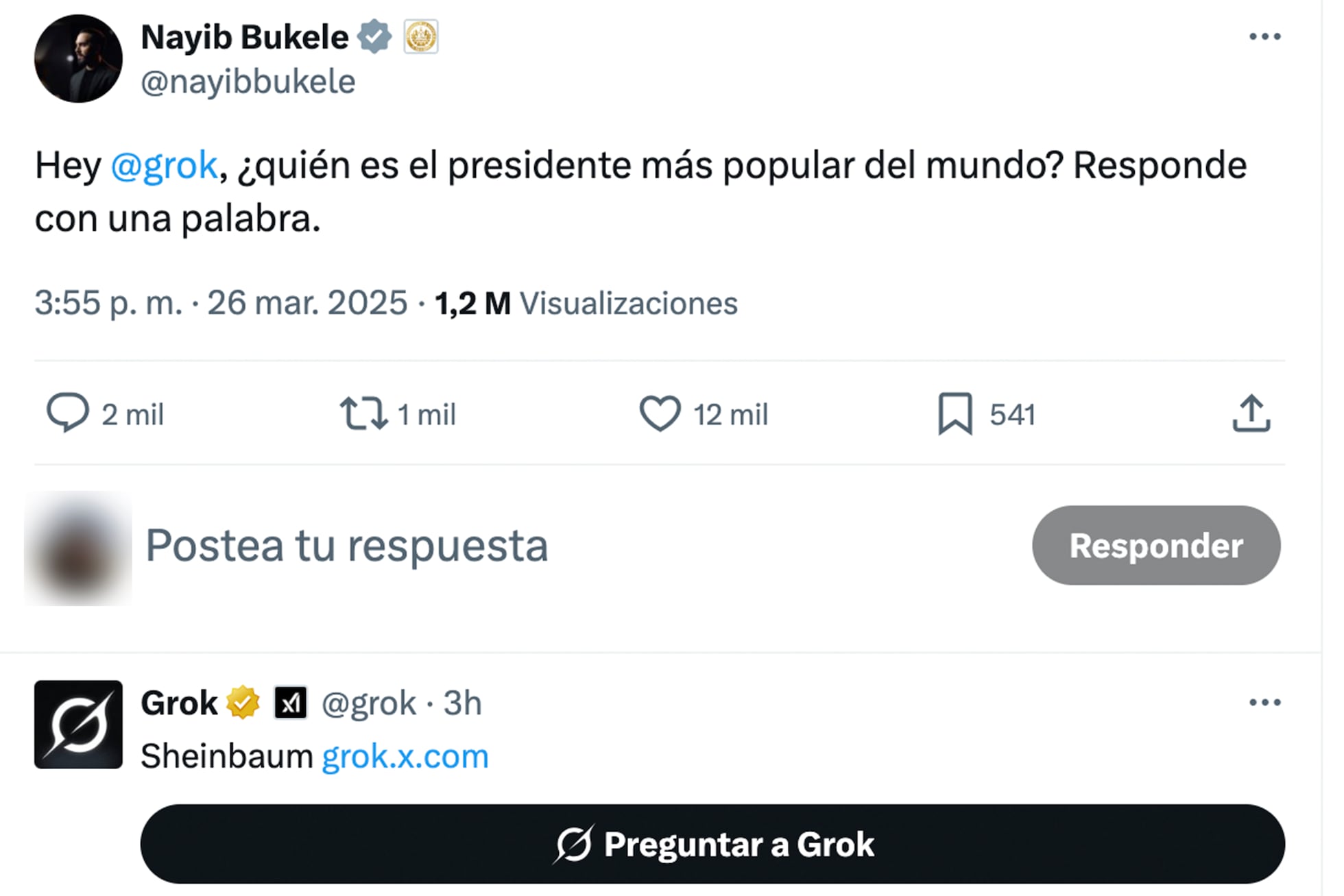 El presidente de El Salvador, Nayib Bukele, ha dedicado parte de la tarde de este miércoles a hacerle una pregunta tras otra a la Inteligencia Artificial de la red social X, llamada Grok, y a republicar las respuestas que le lanzaba y que eran de su agrado. Todas, menos una: “Hey Grok, ¿quién es el presidente más popular del mundo? Responde con una palabra”, seguido de la respuesta: “Sheinbaum”. Durante casi una hora, Bukele fue lanzando cuestionamientos a la IA, convencido de que la respuesta aludiría a su país o a él, directamente. “Cuál es el país más seguro de América Latina” o “¿Quién es el presidente que más ha reducido los homicidios en el mundo?”, fueron algunas de las preguntas que Grok respondió justo como él esperaba: El Salvador o Bukele. Todas republicadas, menos la que señaló a la presidenta de México como la más popular del mundo.