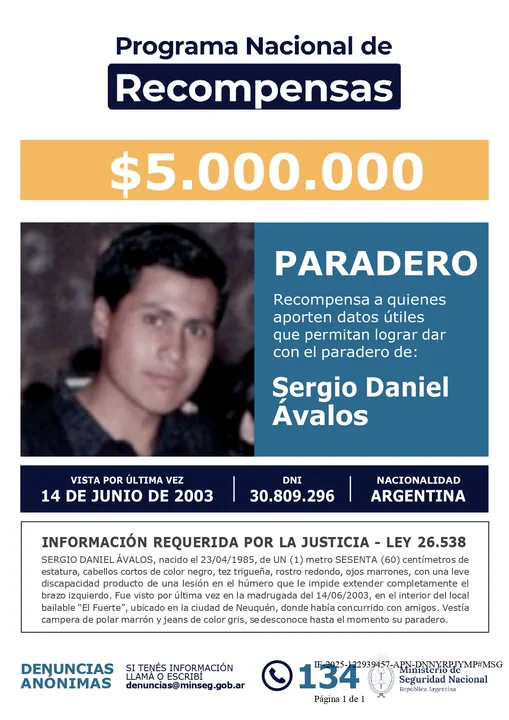 El Ministerio de Seguridad Nacional incrementó la recompensa para dar con el paradero de Sergio Daniel Ávalos, el joven que en junio de 2003 desapareció a la salida de un boliche en Neuquén y nunca más se supo de él.