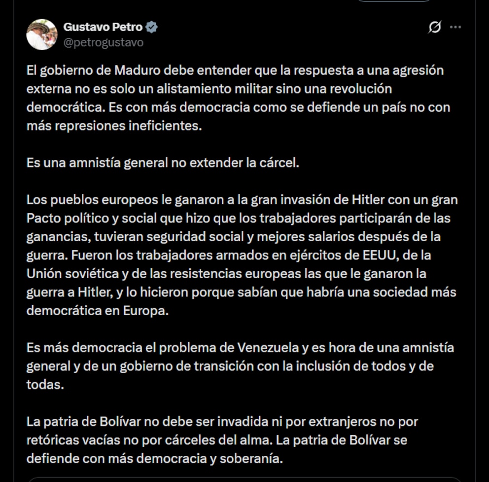 “El Gobierno de Maduro debe entender que la respuesta a una agresión externa no es solo un alistamiento militar sino una revolución democrática. Es con más democracia como se defiende un país no con más represiones ineficientes”, escribió Petro en su cuenta de X.